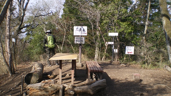 三角点は鶏足山の最高標高点であるが、ふつう鶏足山と言われるのはここではない。「見晴台(弘法大師の護摩焚石)」の案内にしたがい、いったん下ってまた登らなくてはならない。