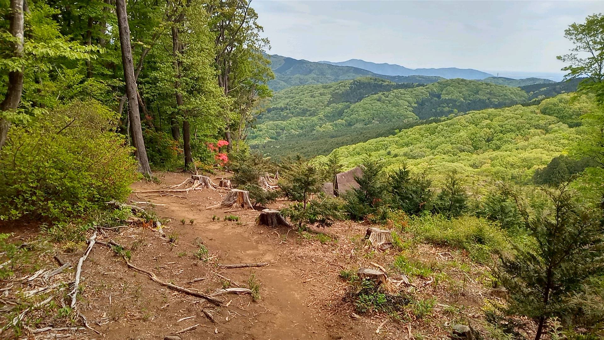 稜線に戻って5分ほど歩くと、「ミツマタの小径」と案内の立っている分岐がみつかった。右折してそちらに向かう。「小径」というだけあって歩きやすい登山道だが、ここ数日の雨でぬかるみが残っている。傾斜もあるので、派手に滑った跡も残っている。