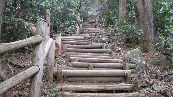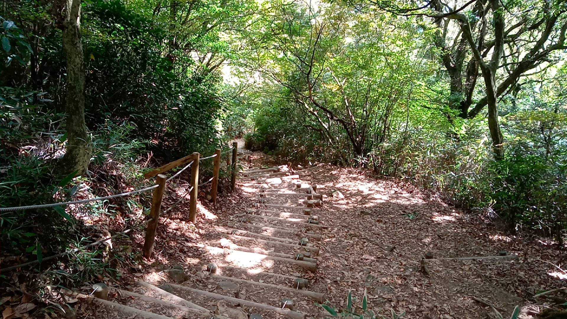 さて、林道を越えてしばらくすると急登「天国への階段」が始まる。標高差でおそらく200mほど、急傾斜の階段が続く。これがあるのは分かっているので、林道での休憩が必要なのである。ばんえい競馬の第二障害と同じである。