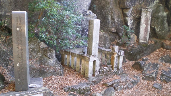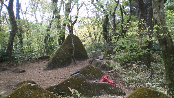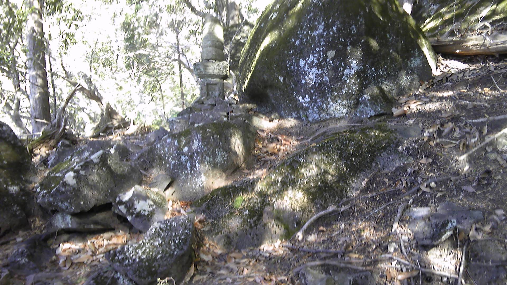 登ってきた秋葉神社ルートで下りるつもりが、V字谷東尾根ルートに出てしまった。尾根の岩場には、古びた石づくりの五輪塔が置かれている。