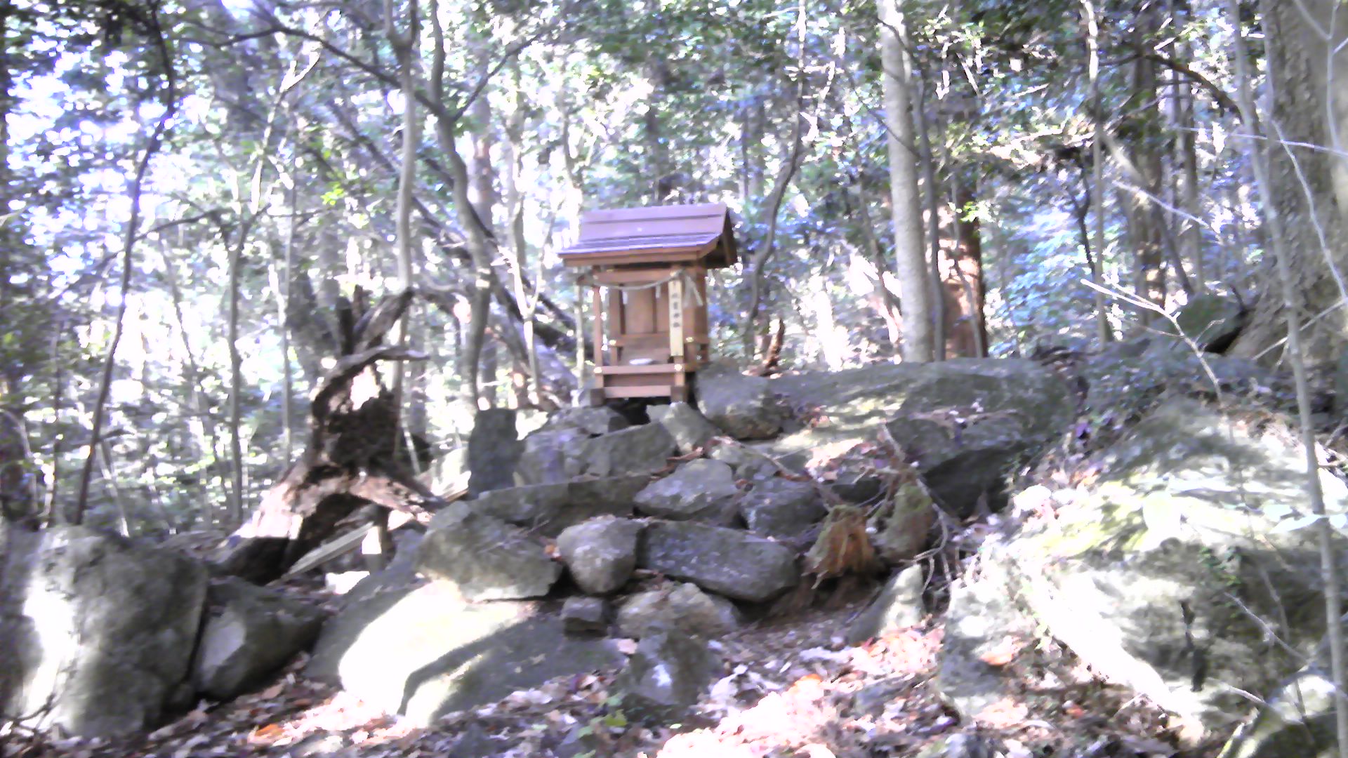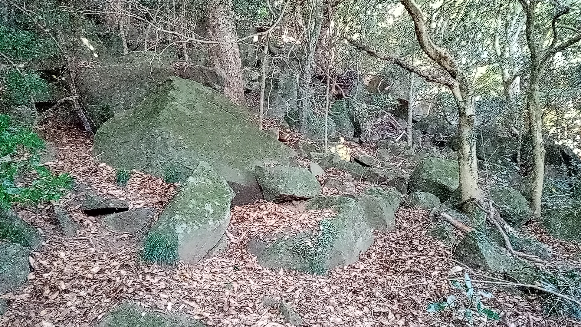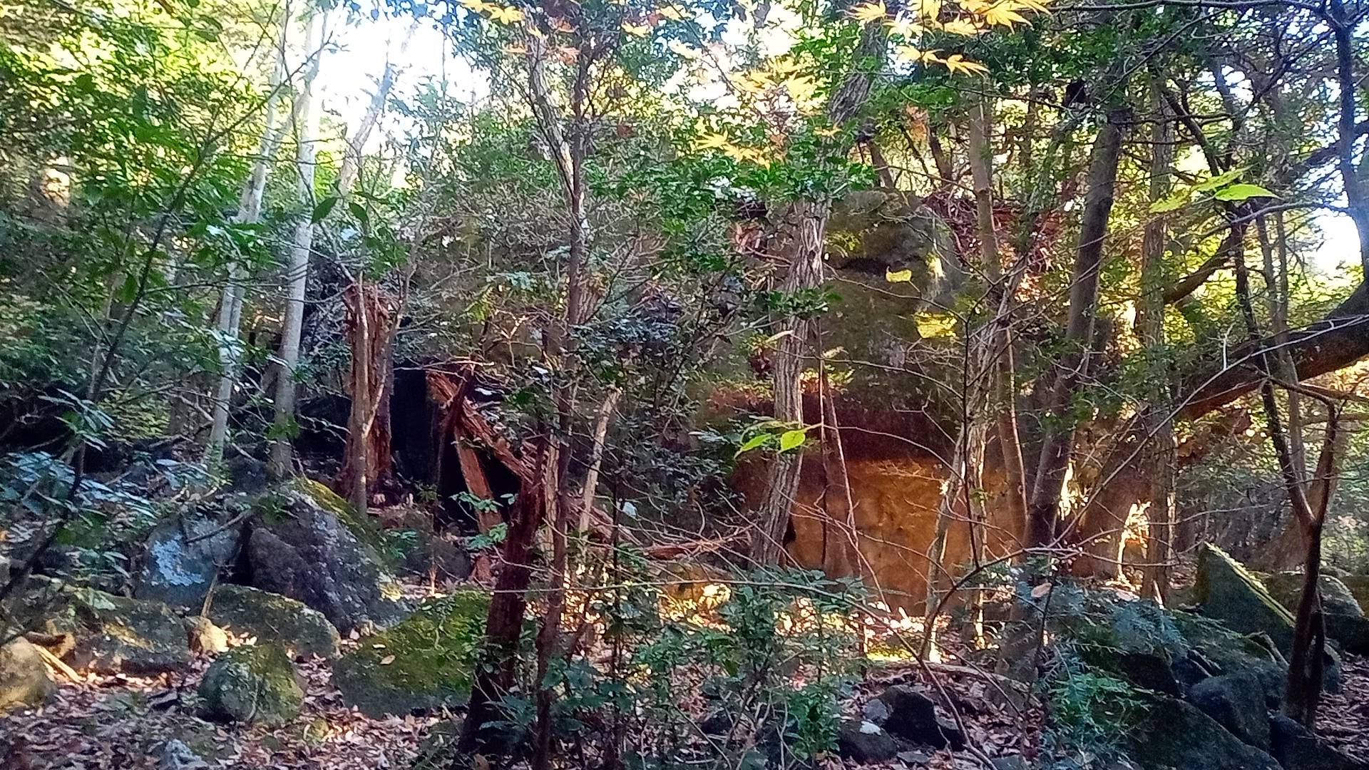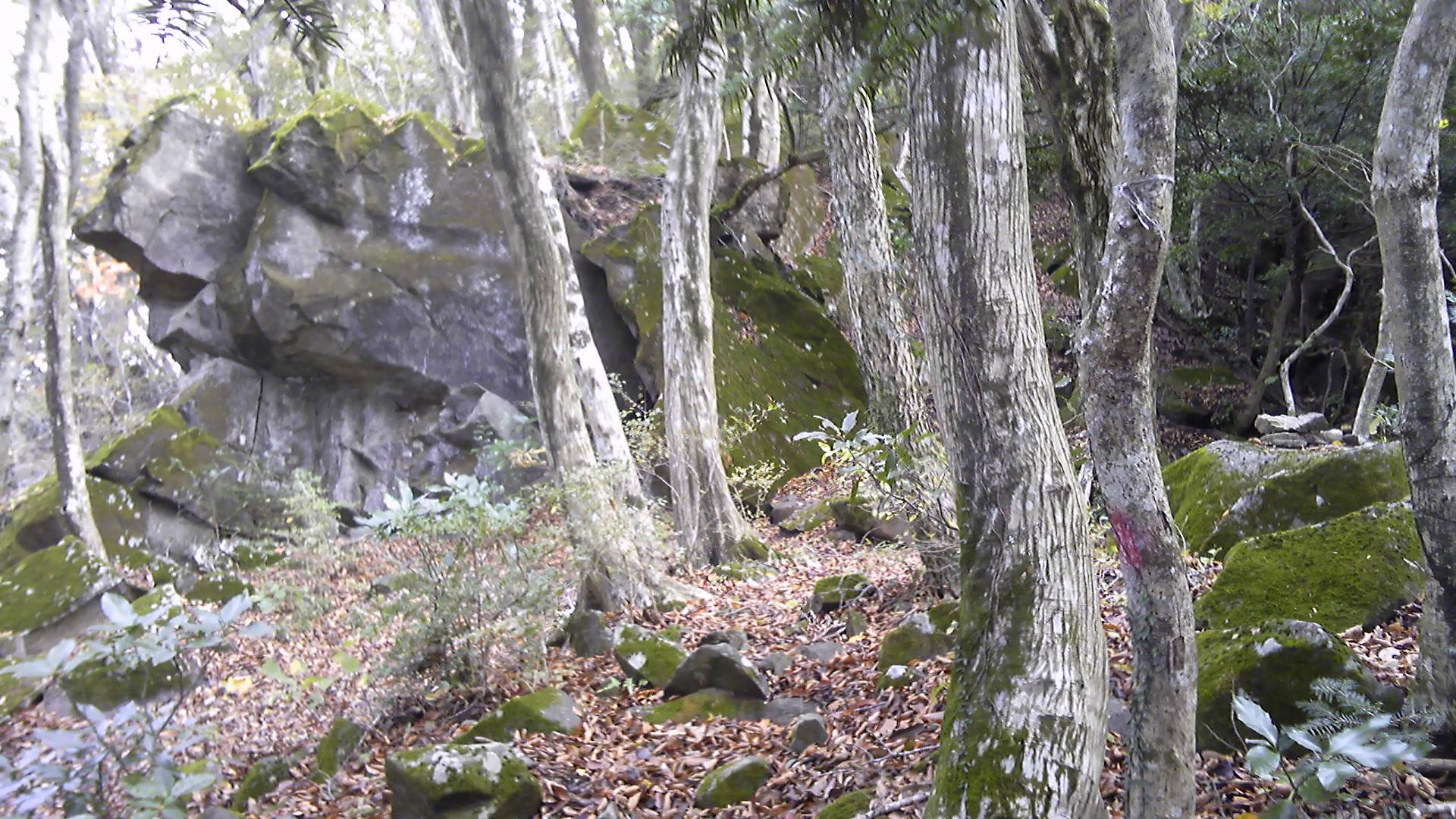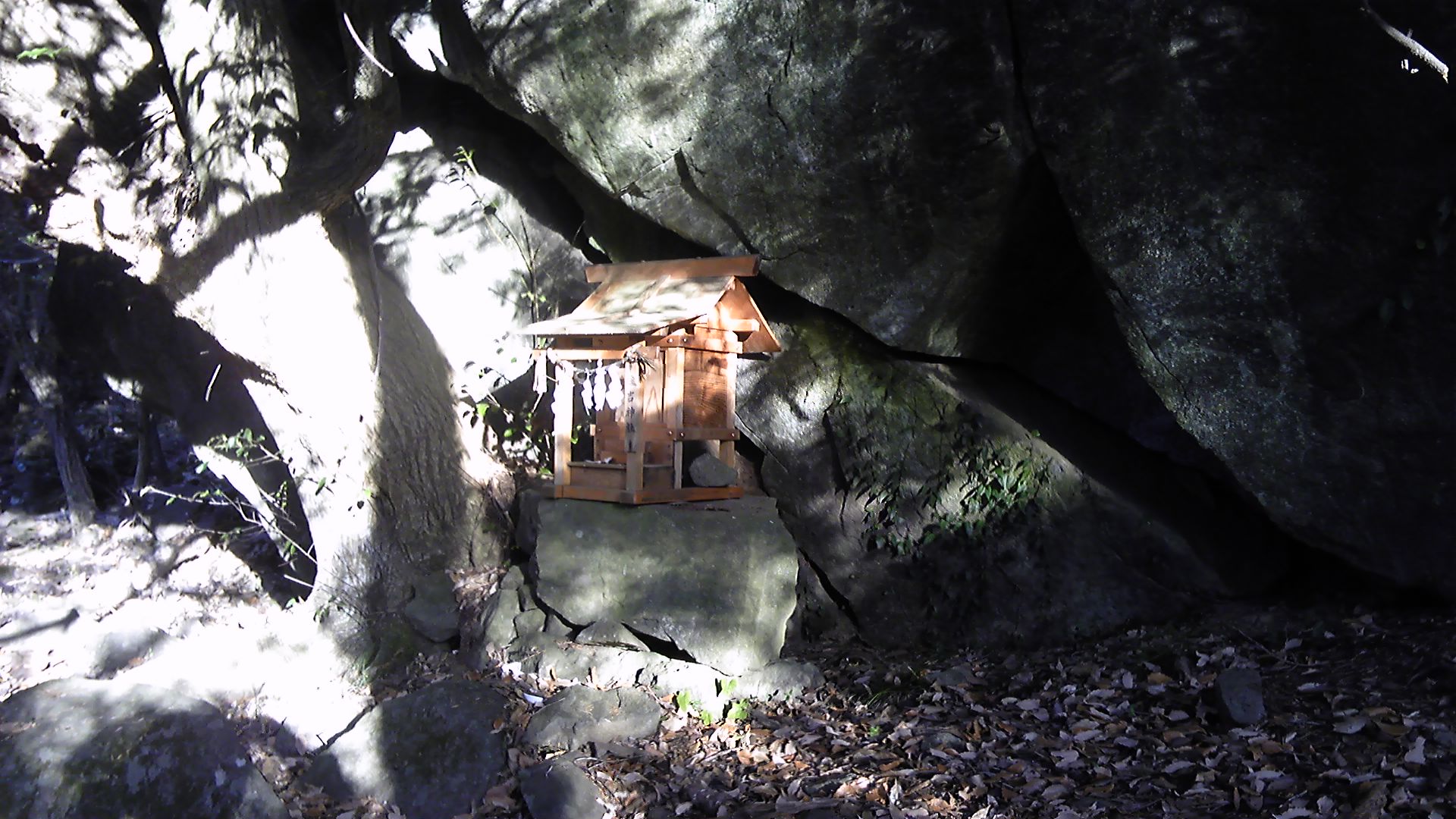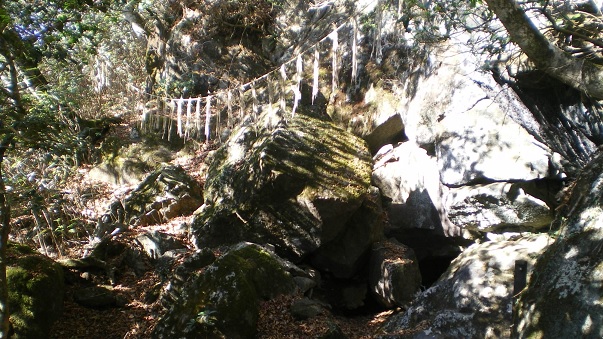 岩の間の踏み跡を登っていくと、突き当りに岩屋のような大きな巨岩がある。注連縄や案内板こそないものの、行場に使われそうな岩屋である。そこから先は太い登山道となり、推奨道のキャンプ場コースまで続いていた。