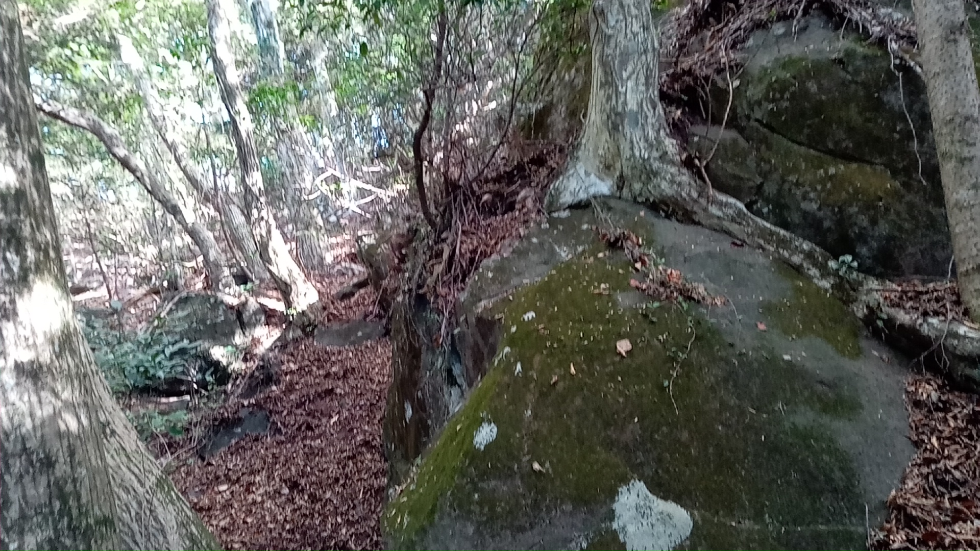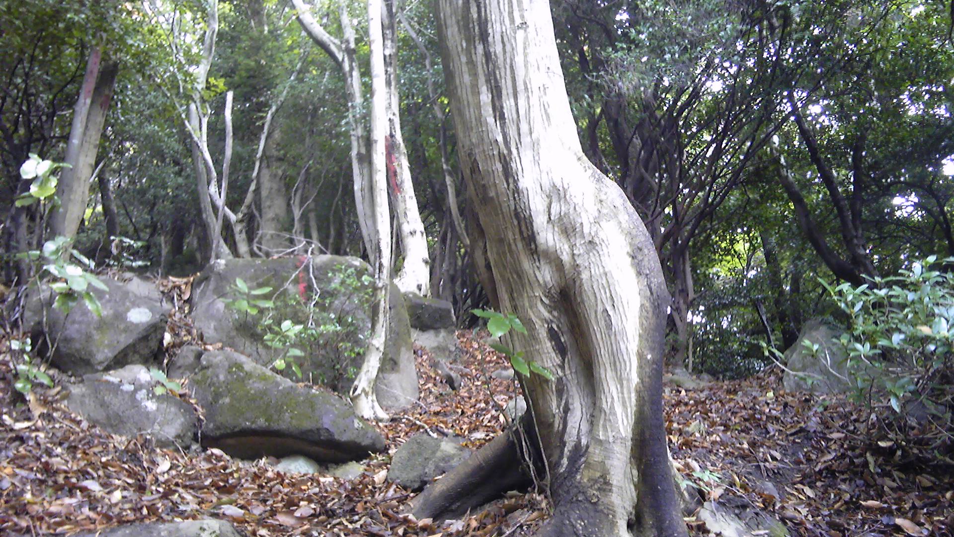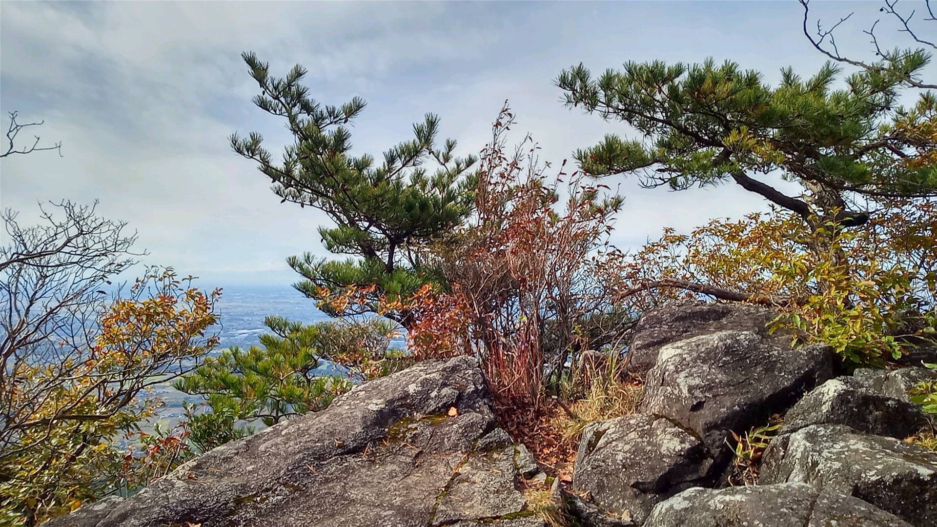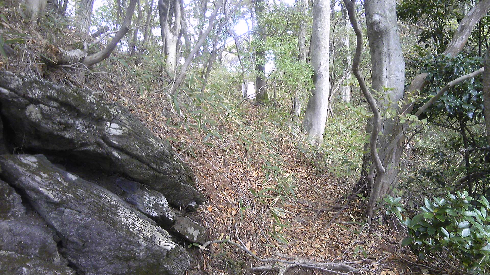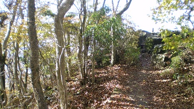 2度ほど落ち葉に足をとられ尻餅をついた。そして気がつくと、目の前に岩場の尾根が見える。迷ったら谷に向かわず尾根に登るのは鉄則である。尾根に登ると、岩場の間に道が続いている。