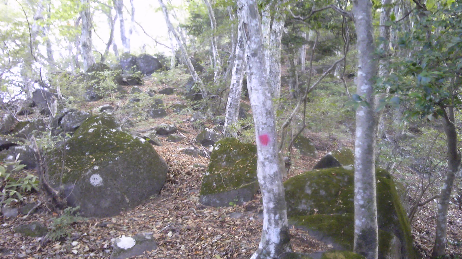 意図した道ではなかったものの、オーソドックスな道だったので安心した。ここから尾根を下れば登りの道に合流することは間違いない。岩場の下りを避けて、尾根の見える東側の踏み跡を下る。