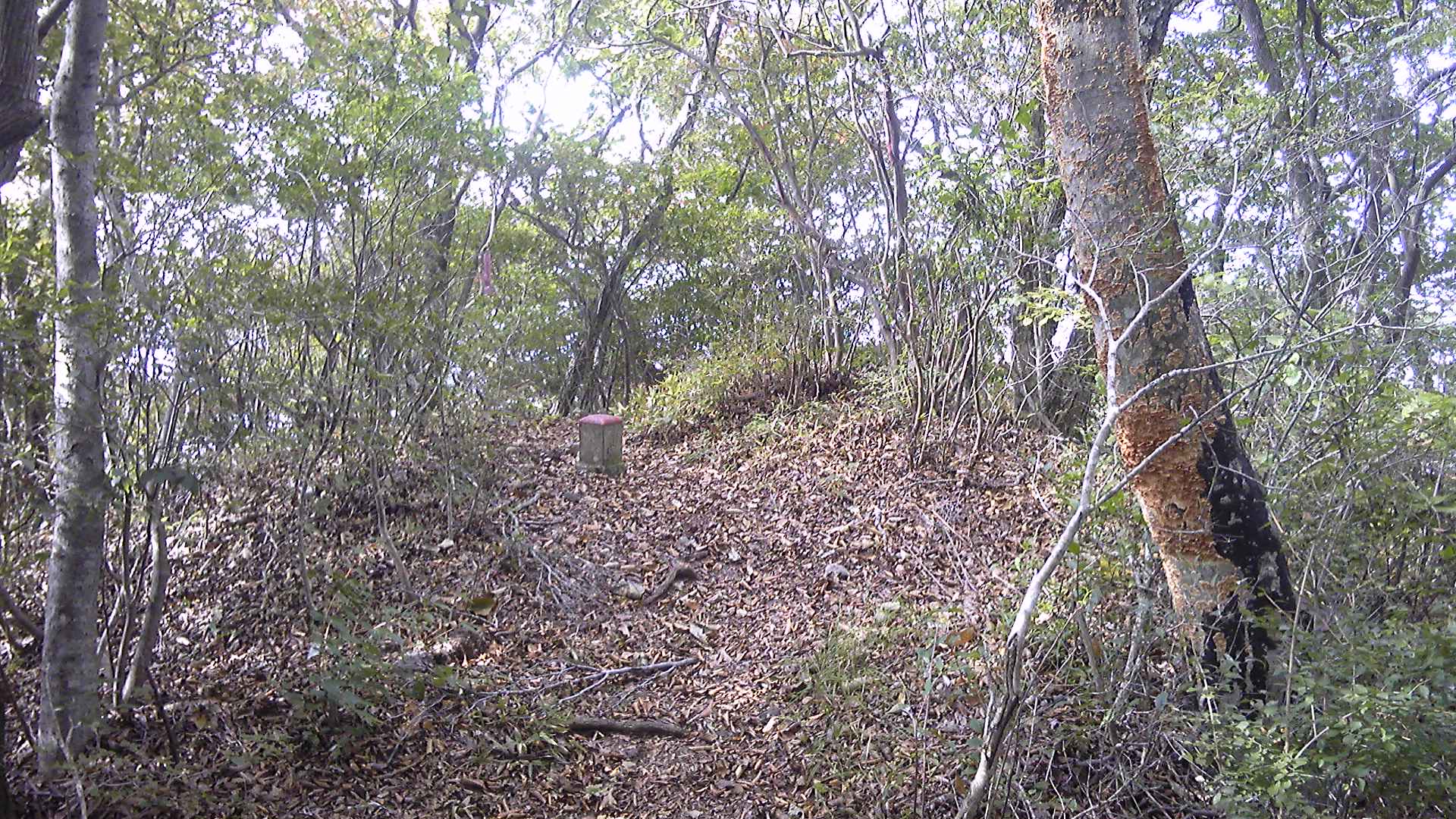 稜線に出ると間もなく三角点。ここが最高標高となるが、ご覧のとおりそれほど眺めは開けていない。
