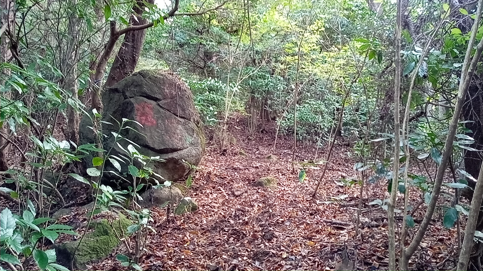 赤ペンキの矢印に従って下りて行く。スマホに残っている登りの経路と違うのは気にしない。登りは薮を越えなければならず、オーソドックスなルートでなかったことは確かだからだ。