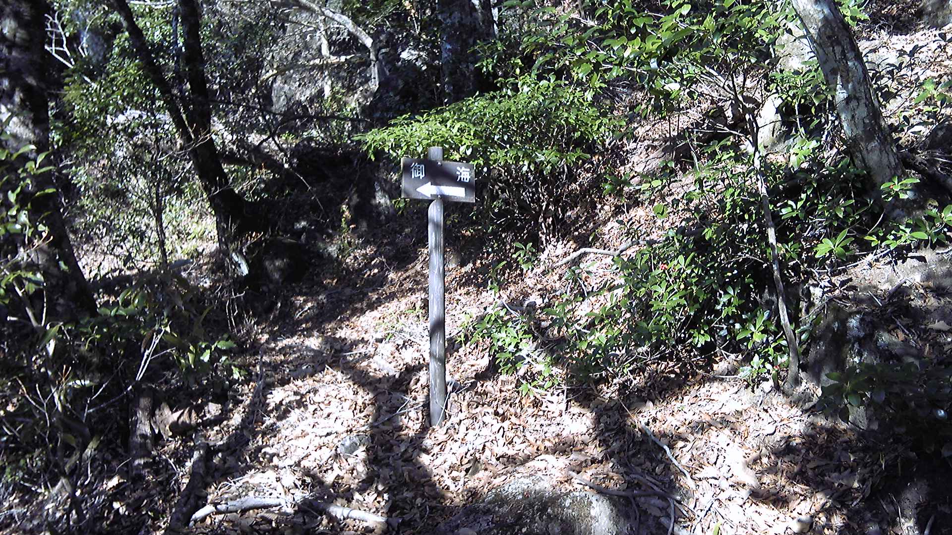 御海まで来ずに下りて行ったシニアグループを追って、ロープ場上の看板から踏み跡に入る。道ははっきりしているが傾斜がきつい。