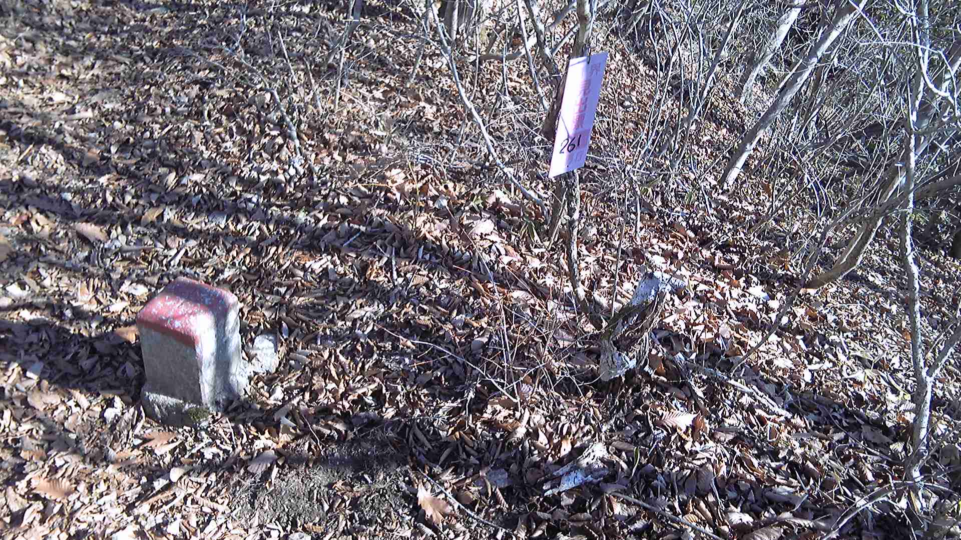 よく見るとすぐ近くの木に林野庁の境界見出標が付けてあり、261番と番号が振ってある。林野庁の国有林データベースでみると、「前峯」とある場所のようだが、林野庁の資料に261と書いてないので確かとはいえない。