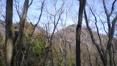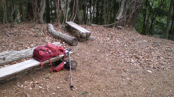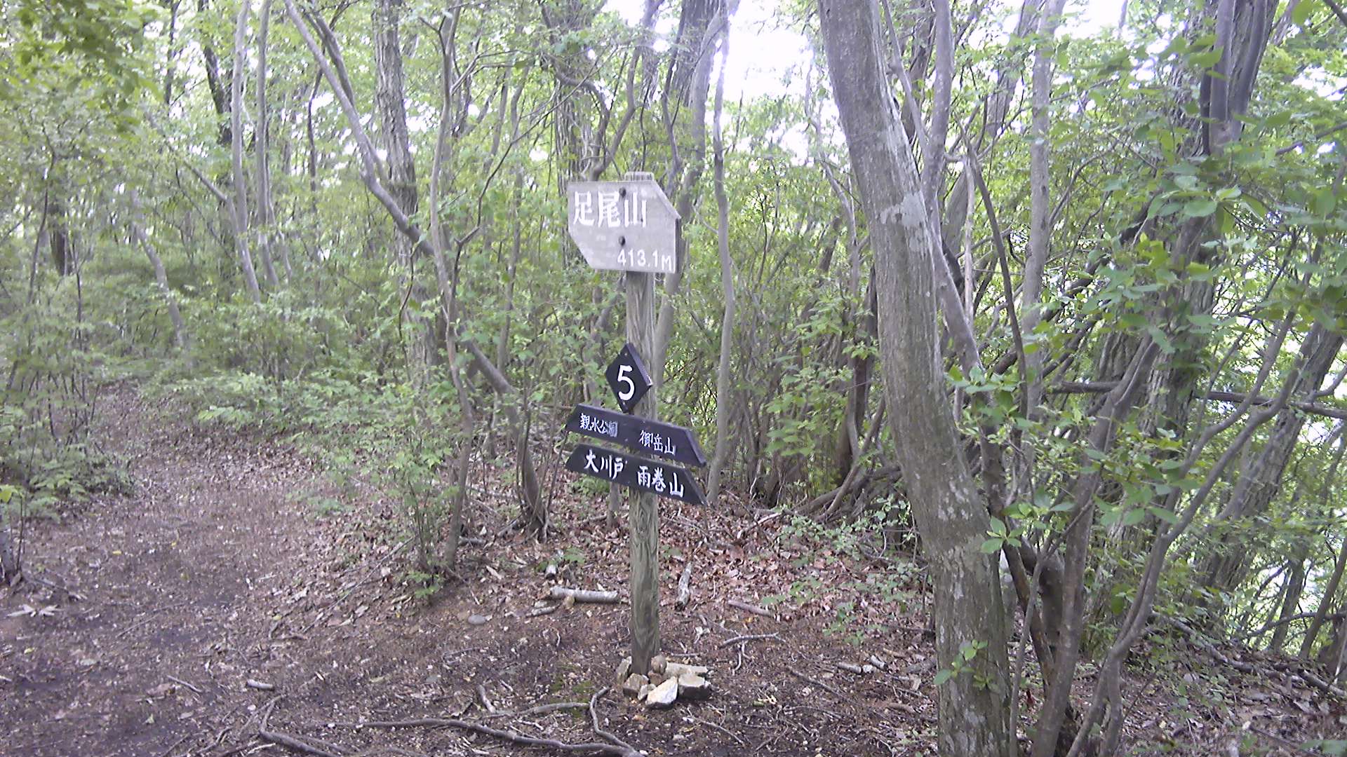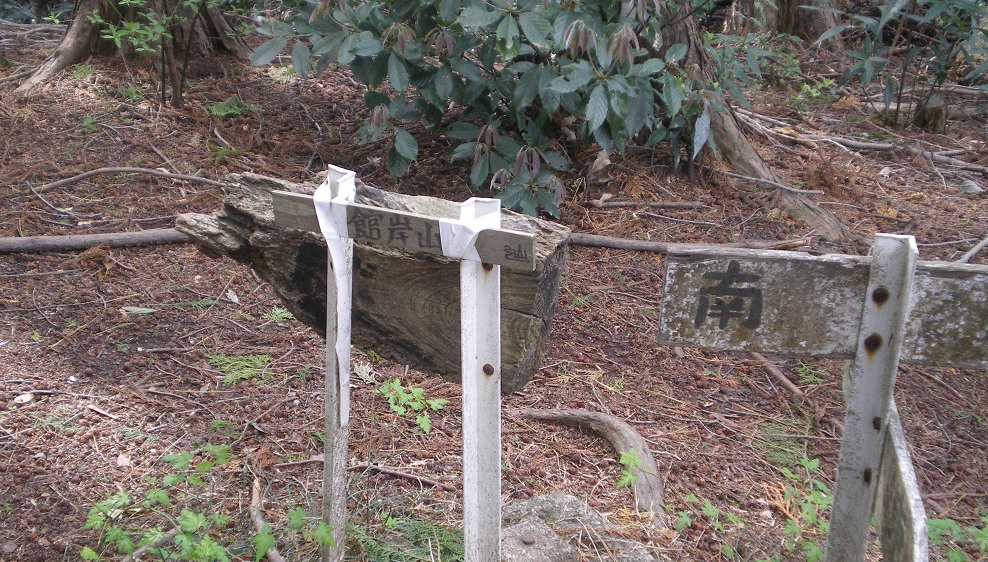 鞍部まで下りて登り返すと足尾山である。周囲は木々が繁って展望はない。ベンチも1脚だけ、崩れかけであった。