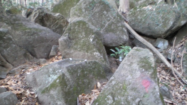 最初のひと登りは踏み跡を辿ったけれど、正面に巨石が立ちふさがった。まっすぐ進めないので左右を窺うと、左に巻き道が見える。巨石の左まで進むとペンキマーク。そこから登れということのようだ。
