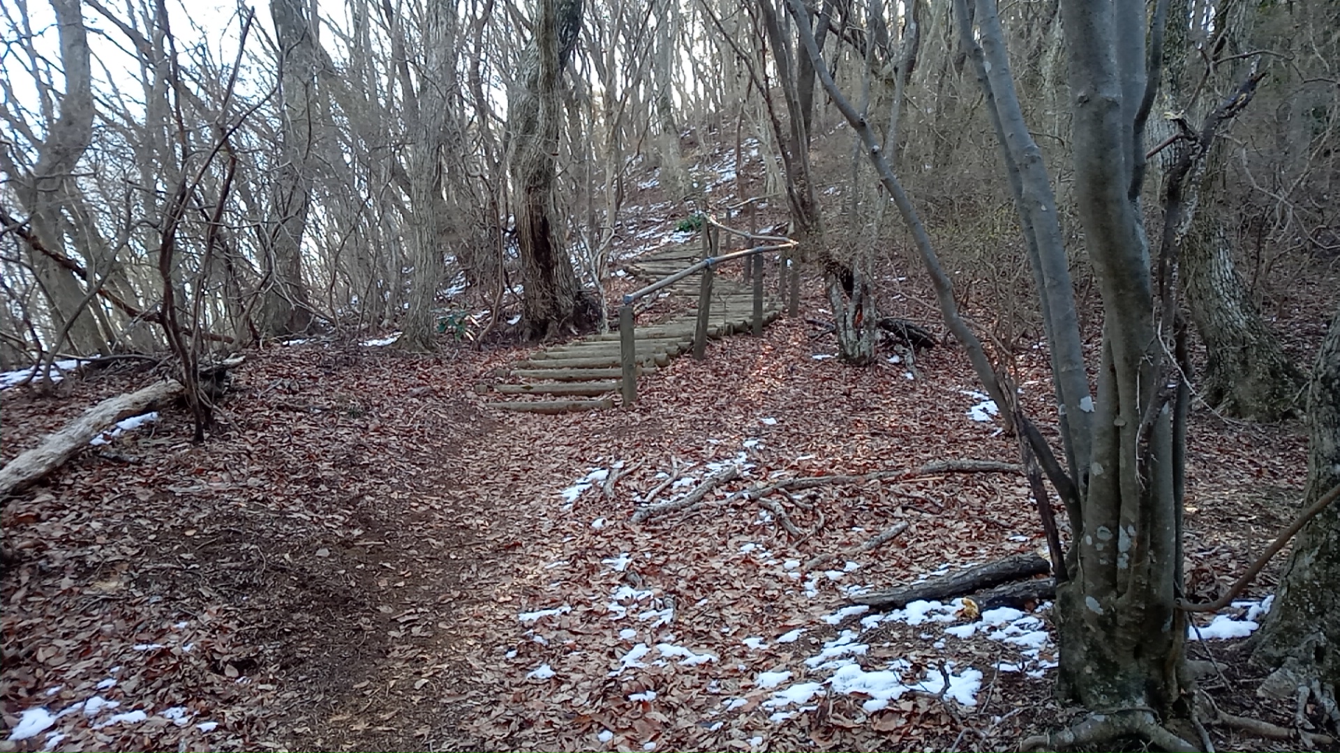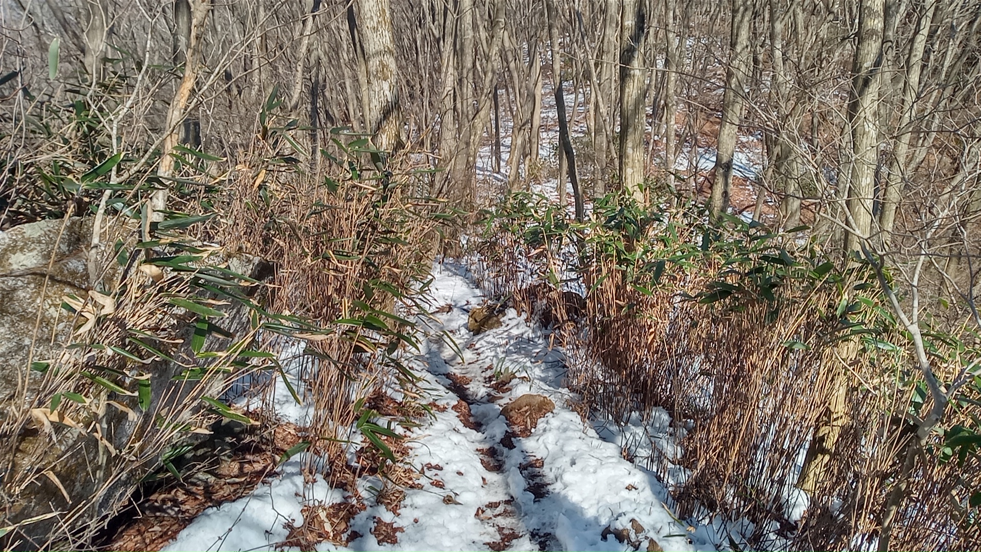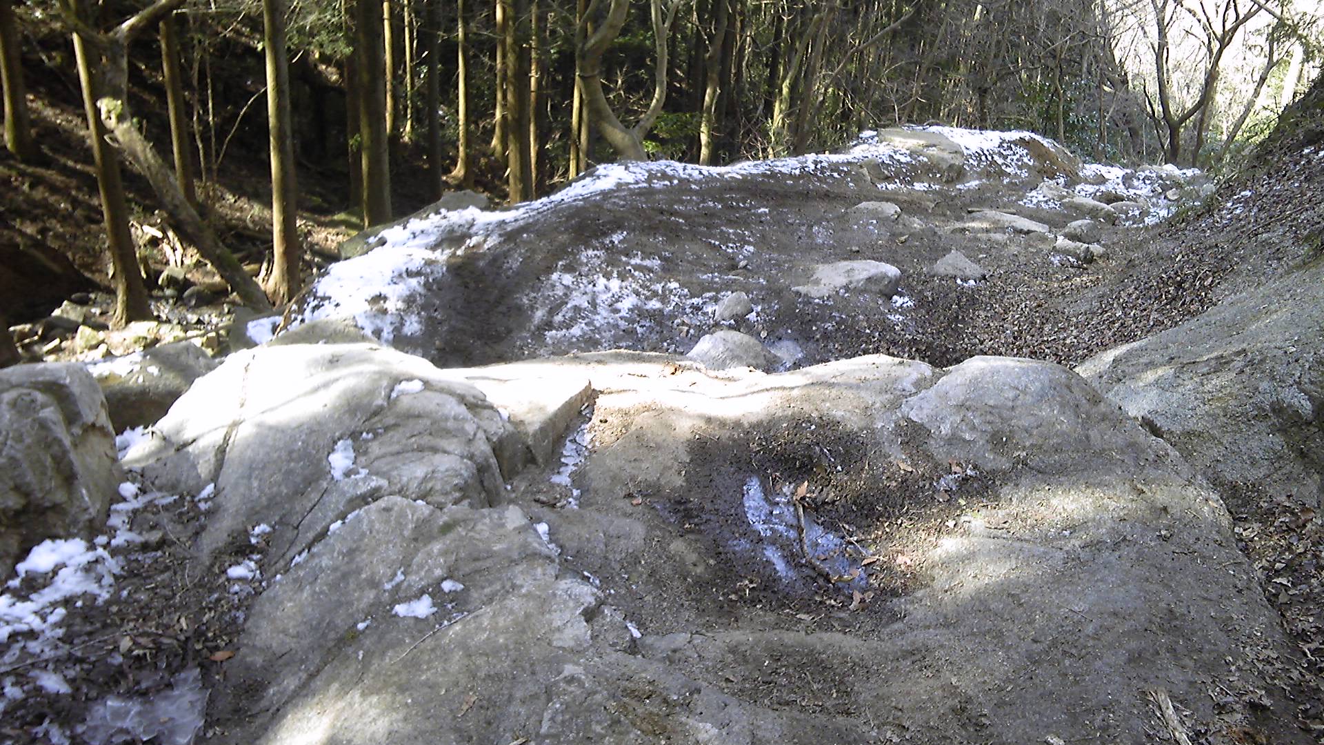 標高800mでアイスバーンでも、標高300mなら霜柱くらいである。転ぶことはあるかもしれないが、岩の上で強打するようなことはなさそうだ。ということで、この時期は宝篋山・小町山周辺を歩くことが多い。