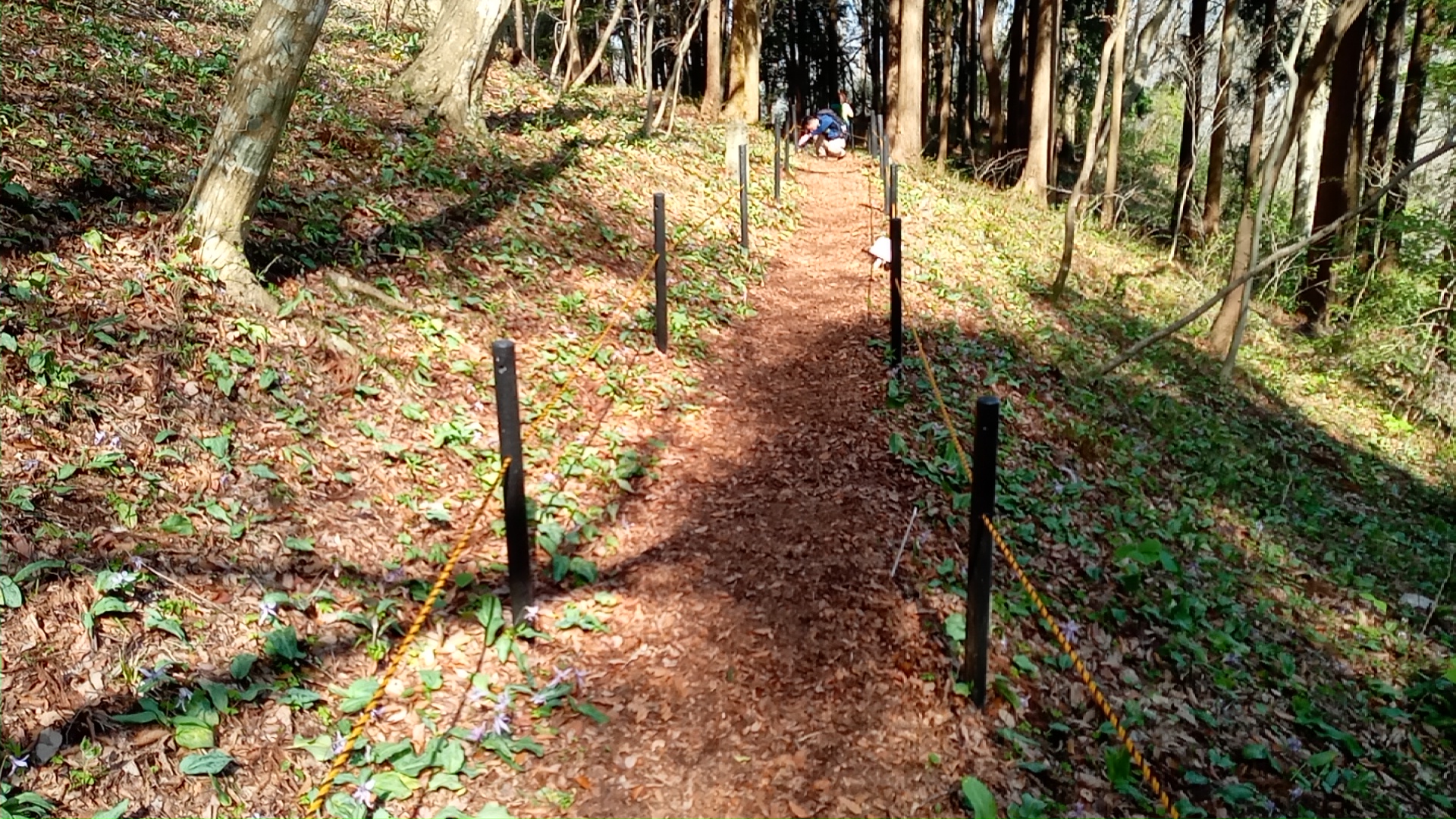 と同時に、方向に間違いなく西に向かって歩いていることが確認できた。いま歩いている燕山中腹道は稜線の下がったところよりずいぶん高いが、それでも自転車のタイヤ痕が続いている。おそらく、このまま関東ふれあいの道まで続くものと思われた。