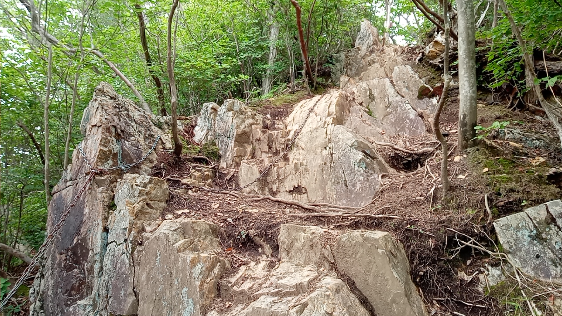 筑波山によくあるなんちゃって鎖場やロープ場とは違って、太くて重い金属チェーンである。しかも、距離が結構ある。中間に踊り場があって一息つけるが、登山者が多く混みあっていたら難儀しそうな鎖場であった。