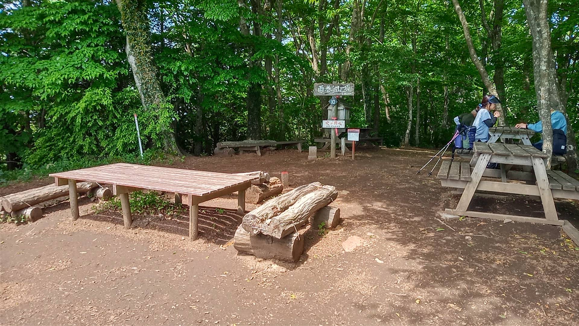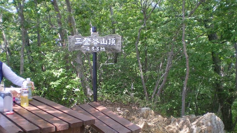 展望コース分岐から5分ほどで三登谷山頂である。山頂にはベンチが置かれているが、狭くて2脚しか置いてない。この日も先客がお昼休憩中、私が水分補給していたので、次のグループが休めなかったのは気の毒であった。