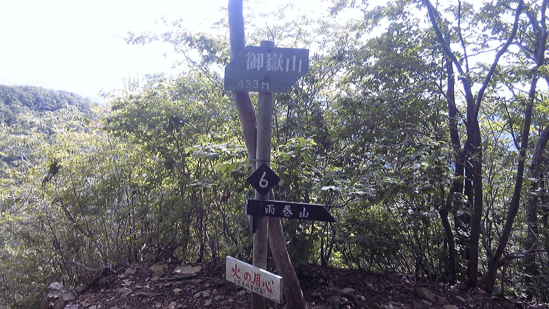 御嶽山までずっと林の中で、山頂ではじめて景色が開ける。一段下に古い手水鉢があったので、おそらく御嶽信仰の山だろう。