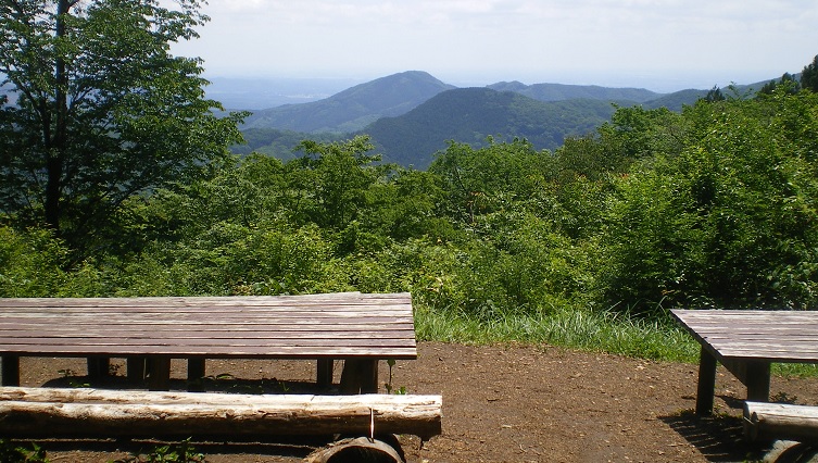 山頂にあるのは案内板の他、テーブル付のベンチが一脚。ここまで登ってはじめて展望が開けた。稜線の東側の山々である。筑波山に慣れているとすぐ海のような気がするけれど、栃茨県境まで来ると茨城県を横切らなければ海にならない。この日は地表近くに雲が多く、とても海まで見えなかった。