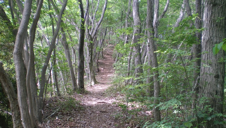 やがて傾斜のないトラバース道になり、向こうから登山者が歩いてきて関東ふれあいの道に合流した。考えていたのとは違って、稜線上にはっきりした分岐があった。急登の始まる地点よりかなり前である。