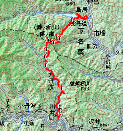 時間はすでに午後1時で、下り始めてから1時間経つ。下りは1時間半のコースタイムというが、1/25000図の残り距離をみるとあと30分では着きそうにない。それはいいとして、いま目の前を通っている林道が1/25000図には載っていない。最近の山行では必ず最新の電子データを用意するのだが、今回は計画を立てたのが一昨年だったので、そこまではやっていなかった。