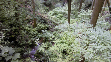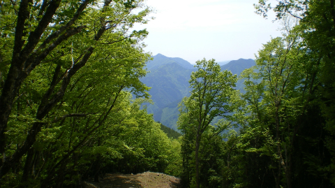 登山道の横では、谷の水を使ってワサビが栽培されているが、こんな藪の中では大変だろうと思った。2、30分歩いて振り返ると、登ってきた谷は本当に藪の中で、上から見るとどこが道だったのか分からないくらいである。