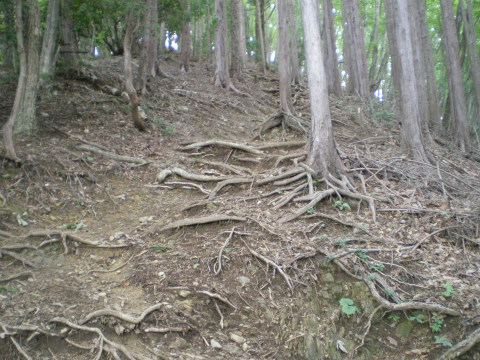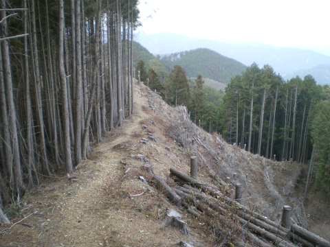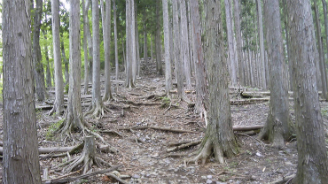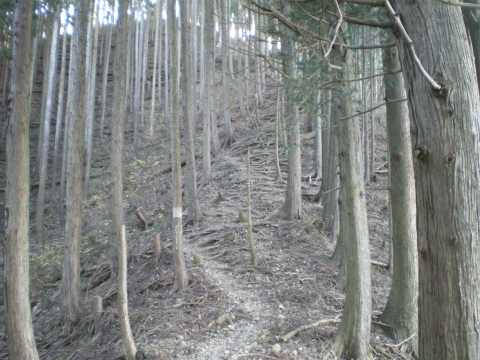 ところがこの尾根、歩き始めるとなかなかきつい。30分ほど急傾斜が続き、30分ほど緩斜面になり、また再び急傾斜になる。ガイド本には伊勢清峯社の鳥居をくぐると書いてあるのだが、そんなものはいつまで登っても見当たらない。人工物のようなものが見えたと思ったら、トタンが置いてあるだけだった。休憩する場所が見つからず、座れそうな切り株を見つけて腰を下ろす。