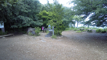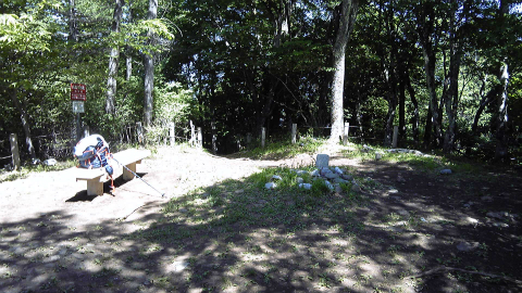 最後は階段になっているちょっとした坂道を登ると、東屋が見えてくる。東屋の奥が一段高くなっており、そこに三角点と山名標が立っていた。山名標のところには先客がいたので、東屋でリュックを下す。到着は10時50分、思っていたよりも10分ほど早く着いた。