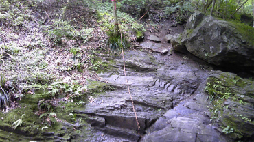 ところが、ここから下でこの日唯一のロープが登場。滑りやすい急傾斜で転んで擦り傷を作ってしまった。