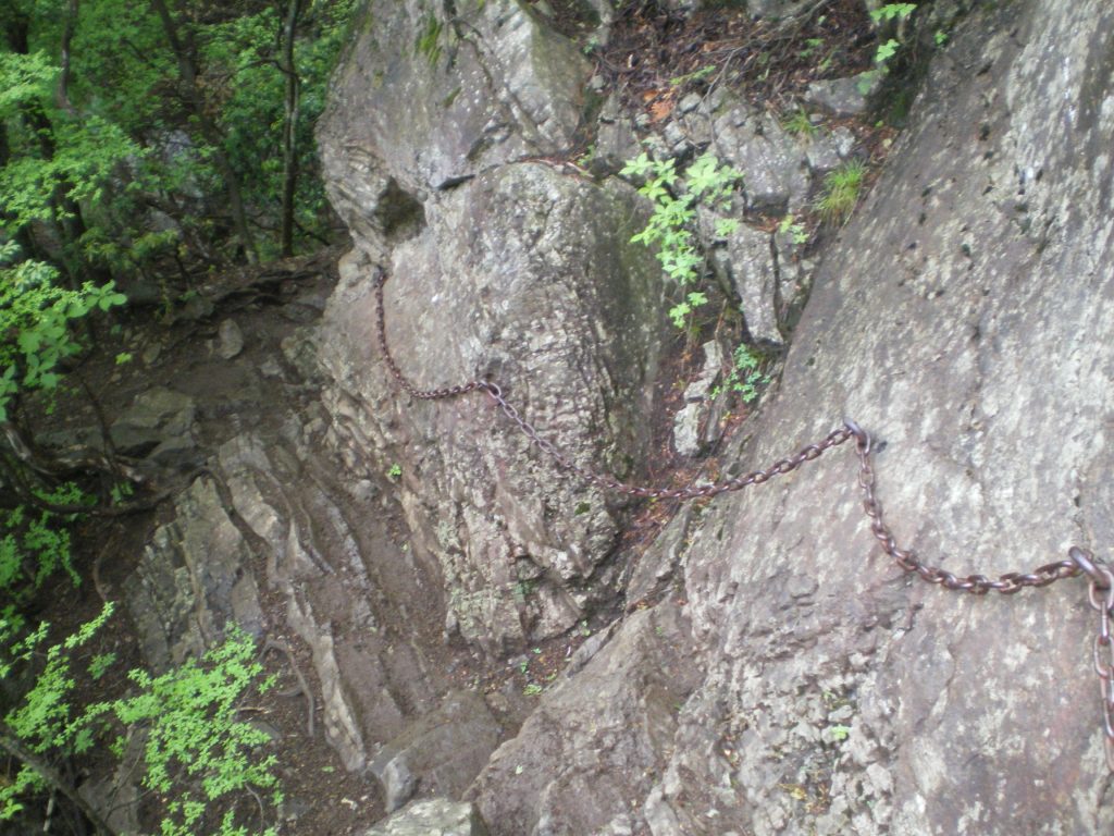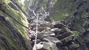 続いて問題の、一部崩壊している鎖場である。足下は先ほどと同様に滑りやすい岩で、しかも浮石になっているところがあるので油断できない。もちろん急傾斜であり、転んで下の岩に頭でもぶつけた日には大ケガ必至である。