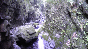 ここを通過すると、左右から岩の壁が迫るゴルジュ。ここまで来るともう登山道も川も一緒であり、登山靴は半分水の中である。さすがにゴアテックスだけあって靴の中まで水は入って来なかったが、ちゃんとした靴でなければ大変なところであった。それと、頭の上からマムシが降ってくるかもしれないと考えると、ゆっくり景色を楽しんでいる余裕はなかった。