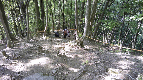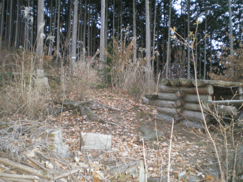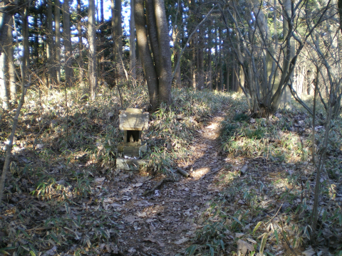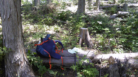 1時間弱歩いたあたりに祠があり、ここから谷を離れて尾根に上がる急傾斜となる。急坂を登るのは苦しいが、藪の中を歩くよりはいい。しばらく登って丸太を横にしてあるあたりで休憩にする。ちょうど谷から冷たい風が上がってきて気持ちがいい。ずっと休んでいたくなるような気分だった。