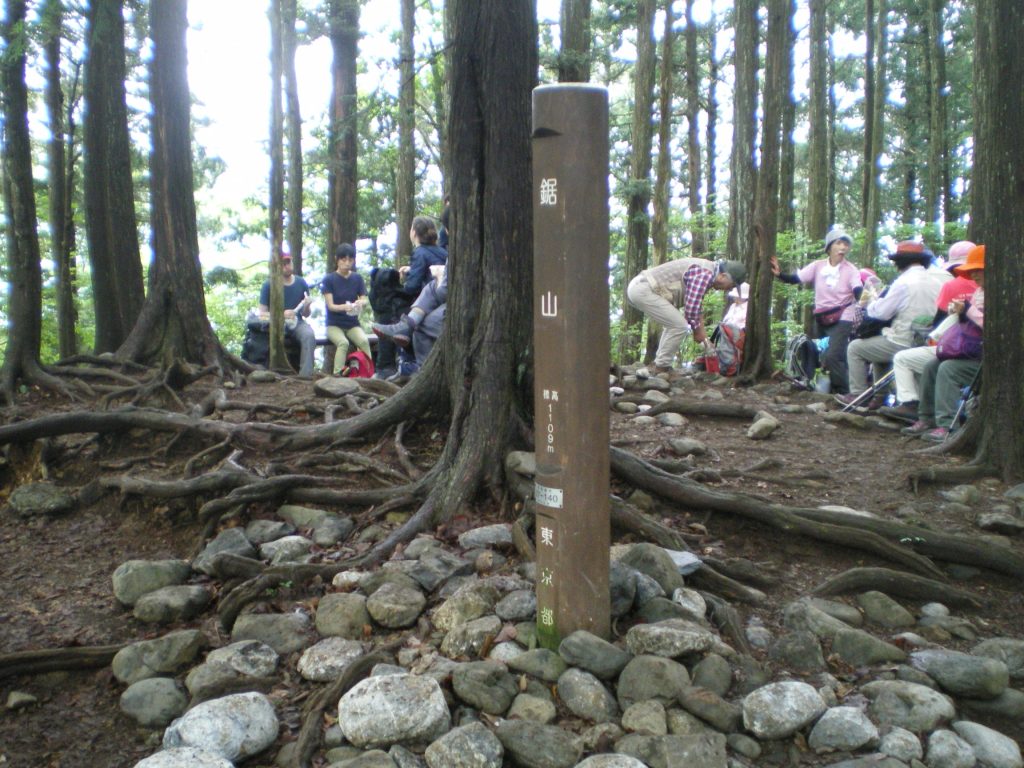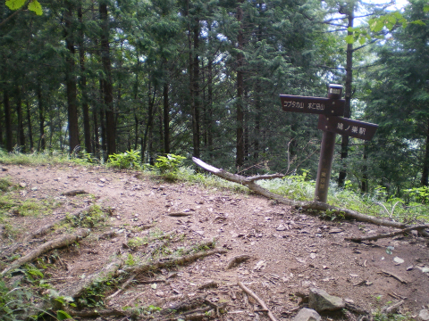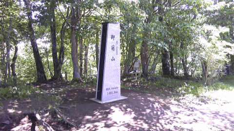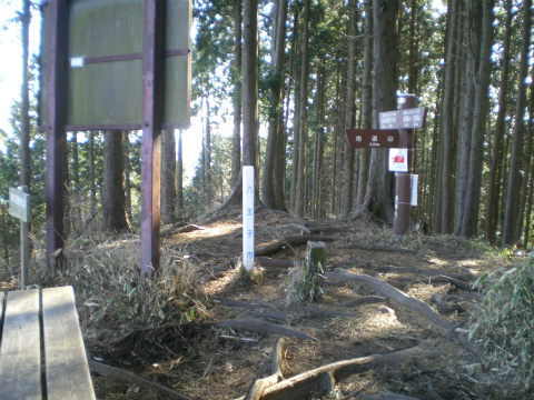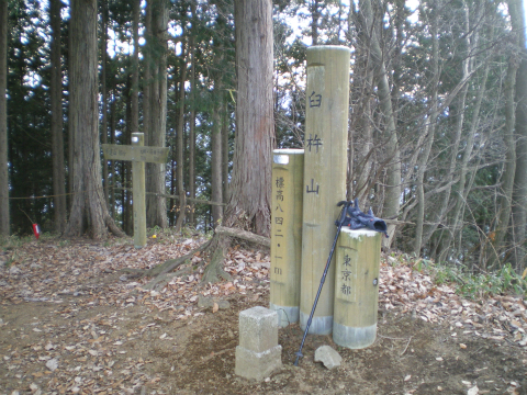 頂上に建てられている立派な山名標は、鷹ノ巣山・六ツ石山と同様のデザインである。石でできていてかなり重そうなので、おそらくヘリで持ってきたものだろう。すぐ近くに三角点も置かれているから、かつては展望が開けて測量が可能だったと思われる。いまではほとんど展望がなく、鷹ノ巣山・六ツ石山を登ったすぐ後だけに残念であった。