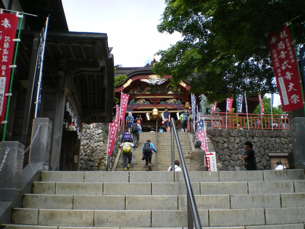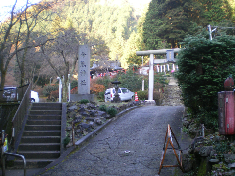 住宅や製材工場が並ぶなだらかな登り坂を進むと、20分ほどで右手に今熊神社が見えてきた。立派な石造りの鳥居があり、建物の横を通ってそのまま登山道まで石段が続いている。まずは、登山の安全を祈願する。地方の神社の中にはひと気のないところも少なくないのだが、こちらの神社はきれいだし、いろいろな案内パンフレットも置いてある。