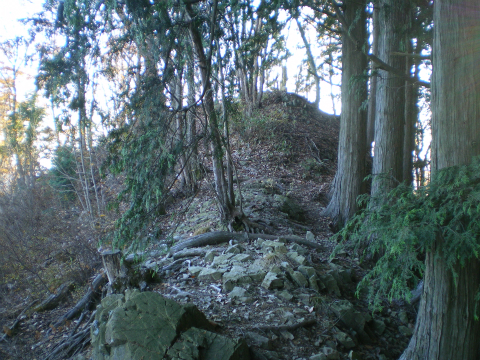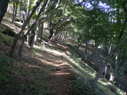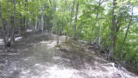 トッキリ場から市道山までの尾根道には「峰見通り」という優雅な名前が付けられていて、木立の合間から遠くの峰々を見ながらゆっくり歩くのだろうと想像していたのだが、想像どおりだったのは最初のピーク2つを巻いた道までで、その後は忠実にピークをたどるアップダウンが続くのであった。