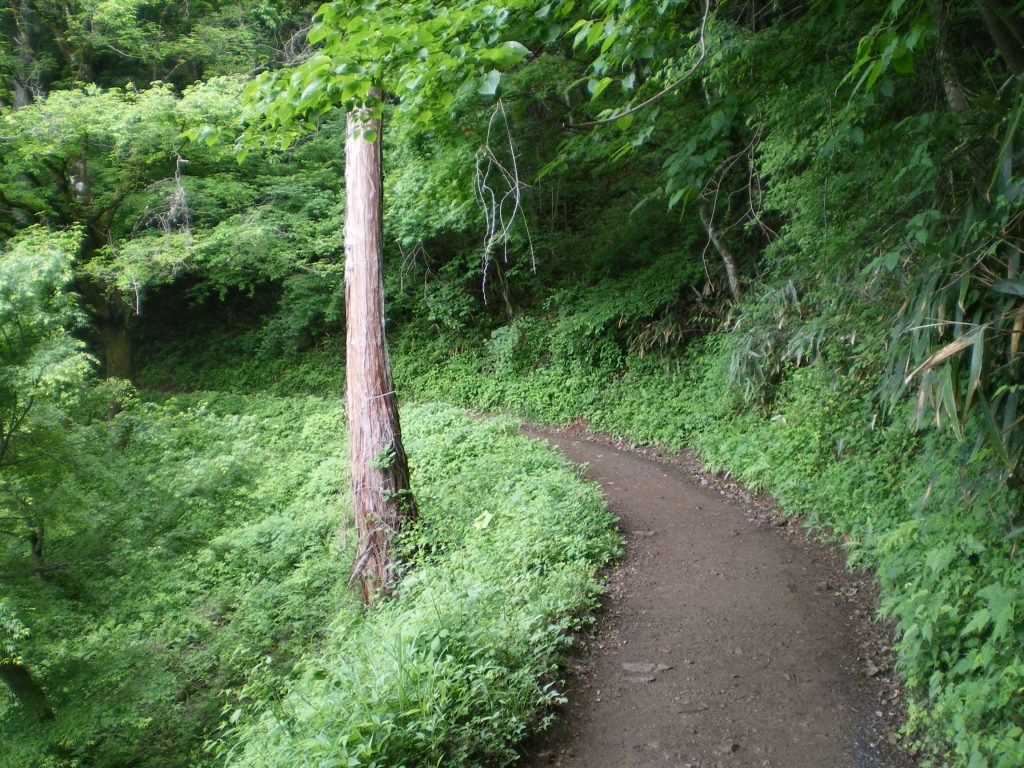 しばらくは谷沿いの道を行く。傾斜はそれほどではないが、上から横から藪が進出してきて、歩きにくくて仕方がない。とがった葉が顔や手に当たるのはあまり楽しくない。そういえば、前に高水三山に登った時も7月で藪が深かったと思い出す。けれど、あの時は5分くらいの藪だったが、ここは15分以上藪の登りを歩かなければならない。