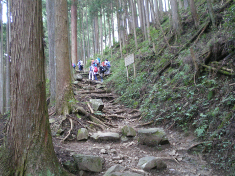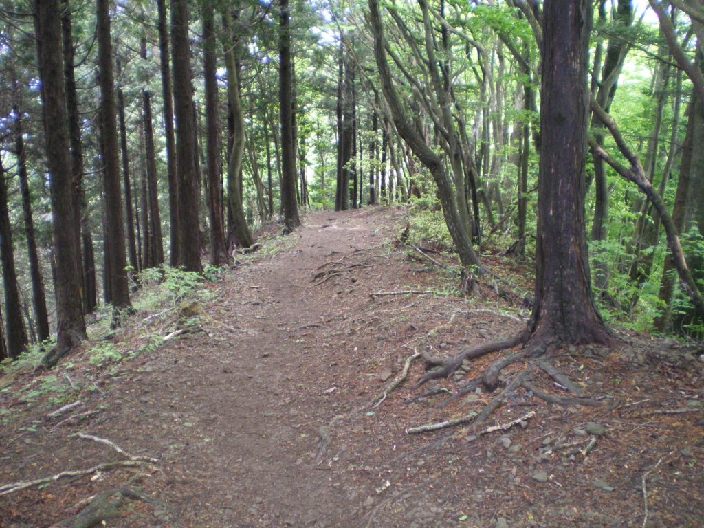 切り株で最初の小休止をした少し上に、「この先道悪し」の立札があった。いよいよここから本格的な登りかと覚悟したが、左側が切れ落ちているだけでたいしたことはなく、再び急斜面と緩斜面がかわるがわる出て来る。急斜面のスイッチバックは見た目以上にしんどく、朝早かったせいか体が重い。気温も高く水の消費が早いので、下山までもつかどうか心配だ。