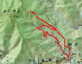 安全策として林道を行ったらどうかと考えたが、1/25000図に載っている近くの林道が延長したのだとすると、山の中を行ったり来たりしているのでいつになったら麓に下りれるか見当もつかない。白谷沢を下れば谷道だけに最短距離だし、初心者コースだから鎖場の1ヵ所くらい崩れていてもそんなに危険なことはないだろうと思って、結局、白谷沢ルートへと突入したのである。