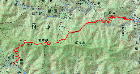 12時10分前くらいに下りにかかる。下りのコースタイムは1時間半と書いてあるので、1時半か少なくとも2時にはさわらびの湯に着けるだろう、ゆっくり風呂に入れると思っていた。もちろんこれは大きな勘違いで、下りでは大変に苦労するのであった。