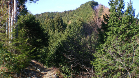 30分休んで、11時25分出発。休憩して体力が回復したのと、このあたりはなだらかな尾根道が続いたので、15分ほどで湯久保山付近に到着。ここから下りようと一時は思ったのだが、そのまま直進した。(帰ってから調べたところ、14時04分と15時24分に藤倉発のバスがあったので、1時間程度の待ち時間で済んだようである)