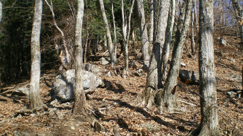 さて、登山道の方は相変わらず急斜面のスイッチバックと緩斜面がかわるがわる出て来る。林の中を歩くので展望が開けないのも同様である。時々、木々の間から浅間嶺方面が見えて、稜線がほぼ目の高さであるのが励みになる。もう標高1100mくらいまで来ているはずである。