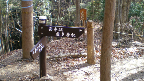 次のピークである惣岳山までは公園の遊歩道のように整備された道で、15分ほどで到着した。御前山からここまでは下山する人達が多かったが、ここで分岐していくつかのコースに分かれる。避難小屋から直に下る道に合流する「体験の森コース」をとることも可能である。