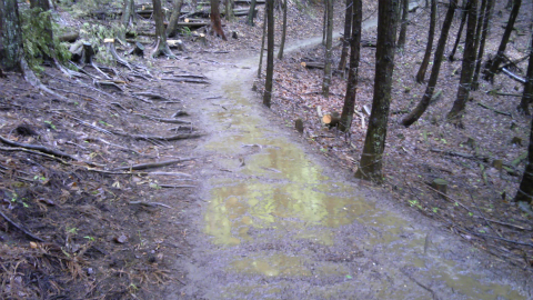 写真を撮ってすぐに出発。ここから下は尾根に沿って下りるスイッチバックの急坂が連続する。展望は相変わらず開けないし、道案内もほとんどない。道は一本道なので迷うことはないが、慎重に下らなければならないのでなかなかペースが上がらない。