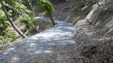 道はしっかりした林道となりカーブを切って標高を下げて行く。この道は電子国土にも載っていないし、吉備人出版の登山詳細図にも未掲載である。