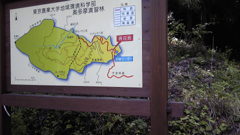 太い道と合流するところに農大演習林の大きな地図が掲げられていて、これによるといま下りてきたのは十二天尾根と見通尾根の中間を通っている作業道なのであった。この道は、電子国土にもなければ吉備人出版の登山詳細図にも掲載されていない。作業道の終点に「農大作業道 関係者以外立入禁止」くらい書いてもらえれば引き返したのだが。