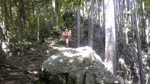 この休憩地点から10分も歩かないうちに、久々の道案内板を見つけた。なんとそこには「御前山 0.9km」と書いてある。900mなら、岩場でも出てこない限りなんとかなる。バスの時間が分からずエスケープを断念した時は不安が一杯だったが、この案内板を見てようやく安心できた。そして、水の不安もとりあえずなくなったから大したものである。