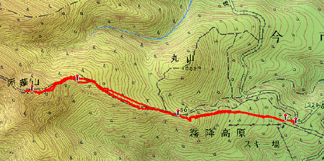 コースマップによると、ここでようやく小丸山から赤薙山までの中間点なのであった。すでに8時15分。小丸山から1時間10分かかっている。半分の距離でこの時間では、コースタイムの1時間30分で赤薙山まで着くのはとてもじゃないが無理である。