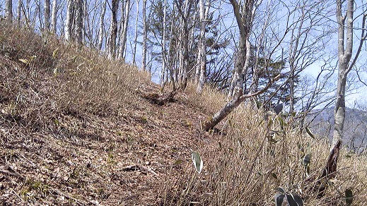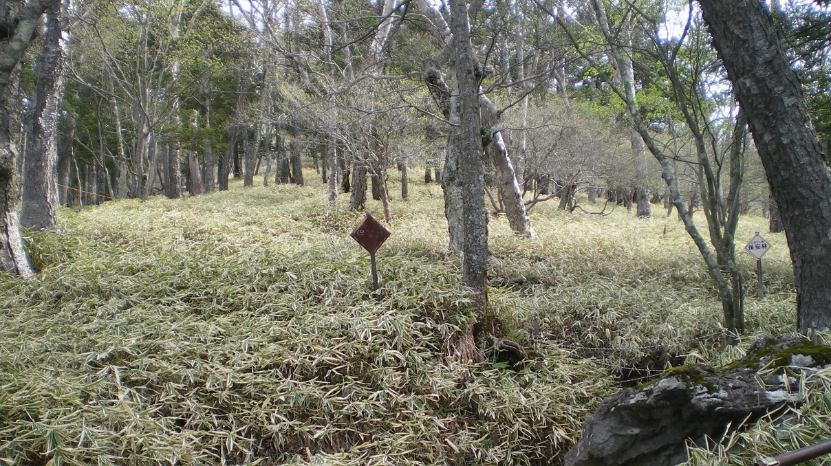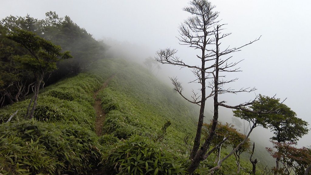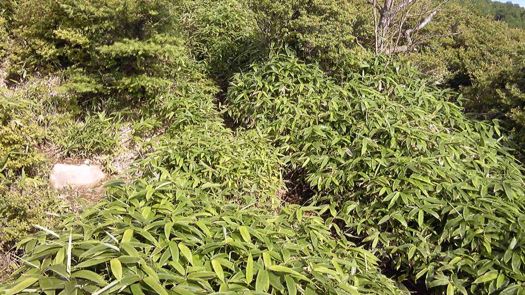 小丸山から上は、ササが覆う不安な道。蜂がひっきりなしに来て、羽音が神経に響く。加えて、ササの朝露が足元を湿らせて、ヒルの不安が募る。