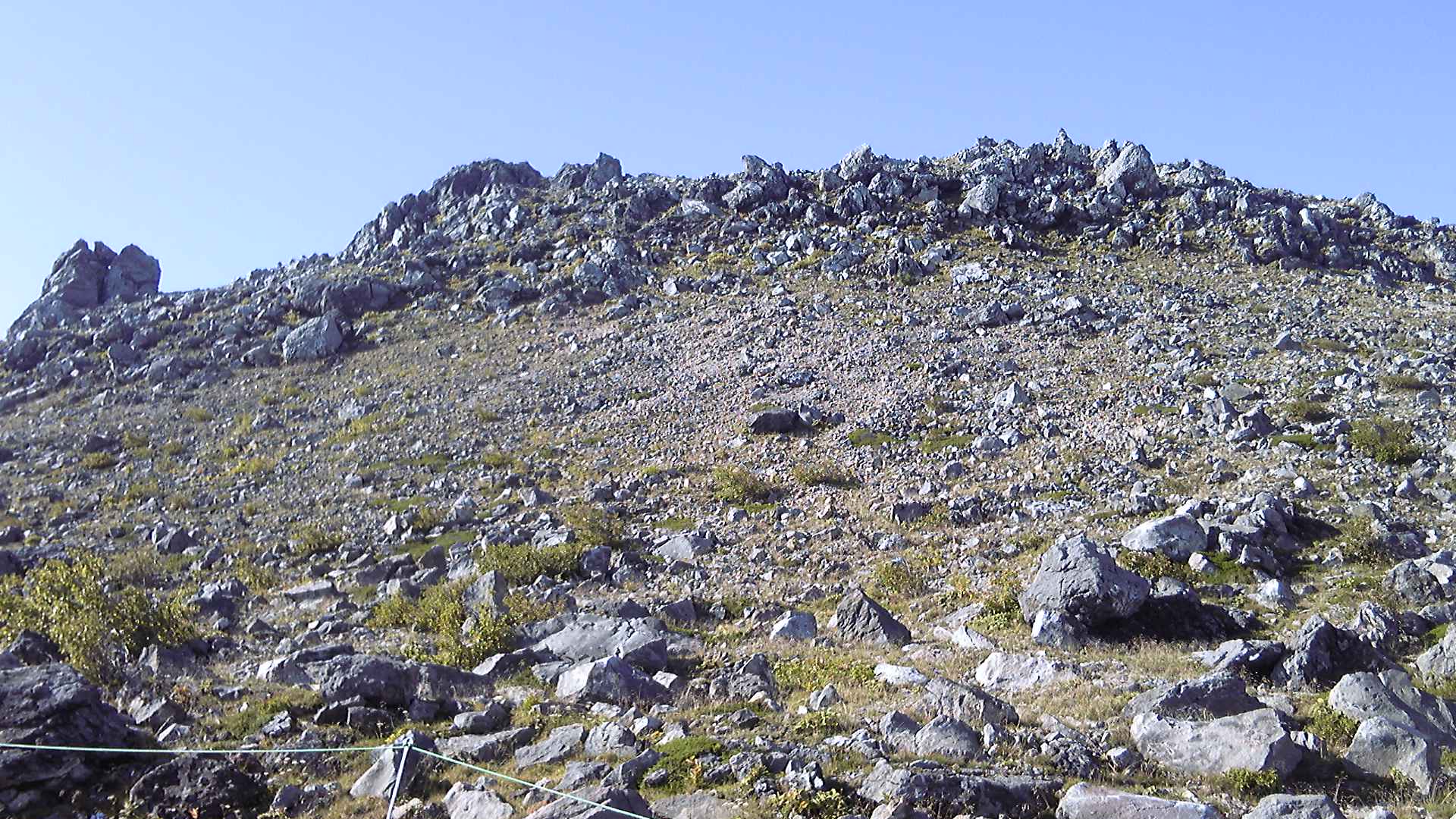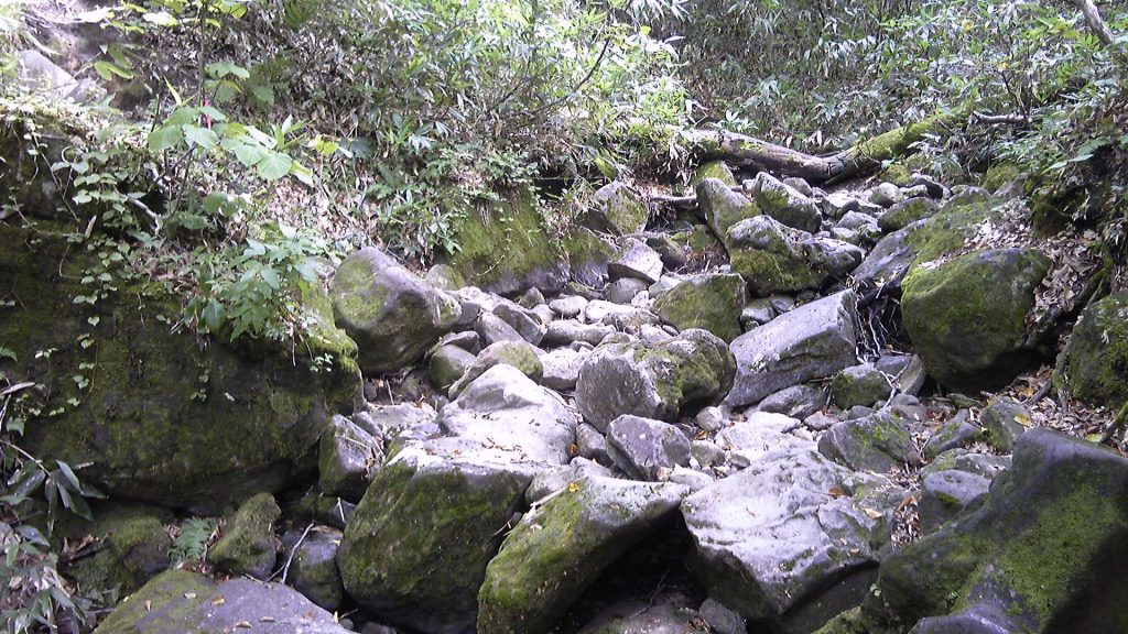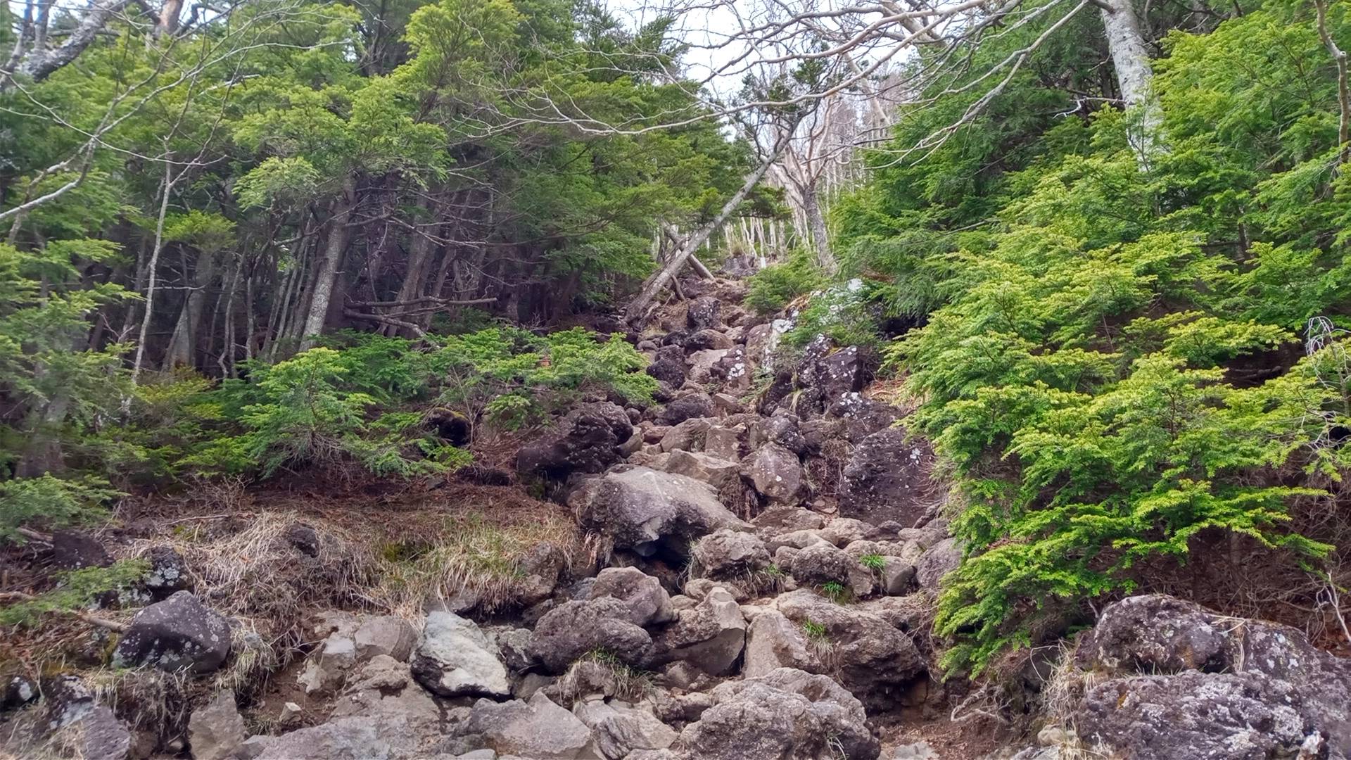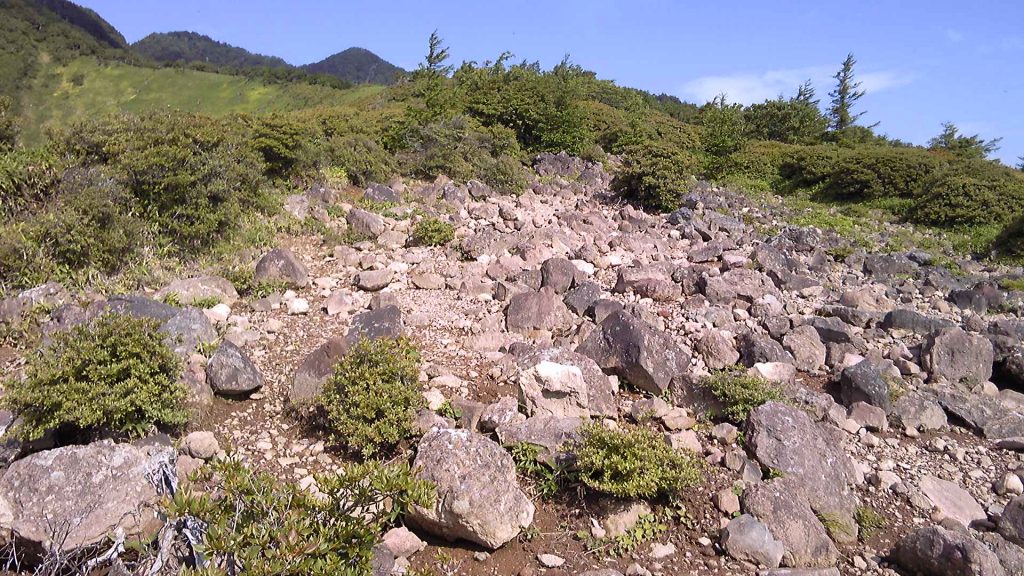 このあたりは踏み跡が錯綜していて、それらしき道筋がいくつもある。いずれも、ササが伸びた踏み跡が続くと、突然ガレ場になる。大雨が降ると川になるようにも見えない地形なので、かつての火山活動によるものだろう。