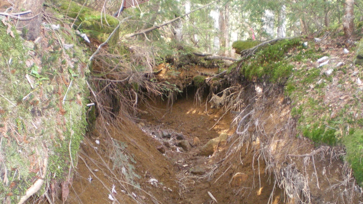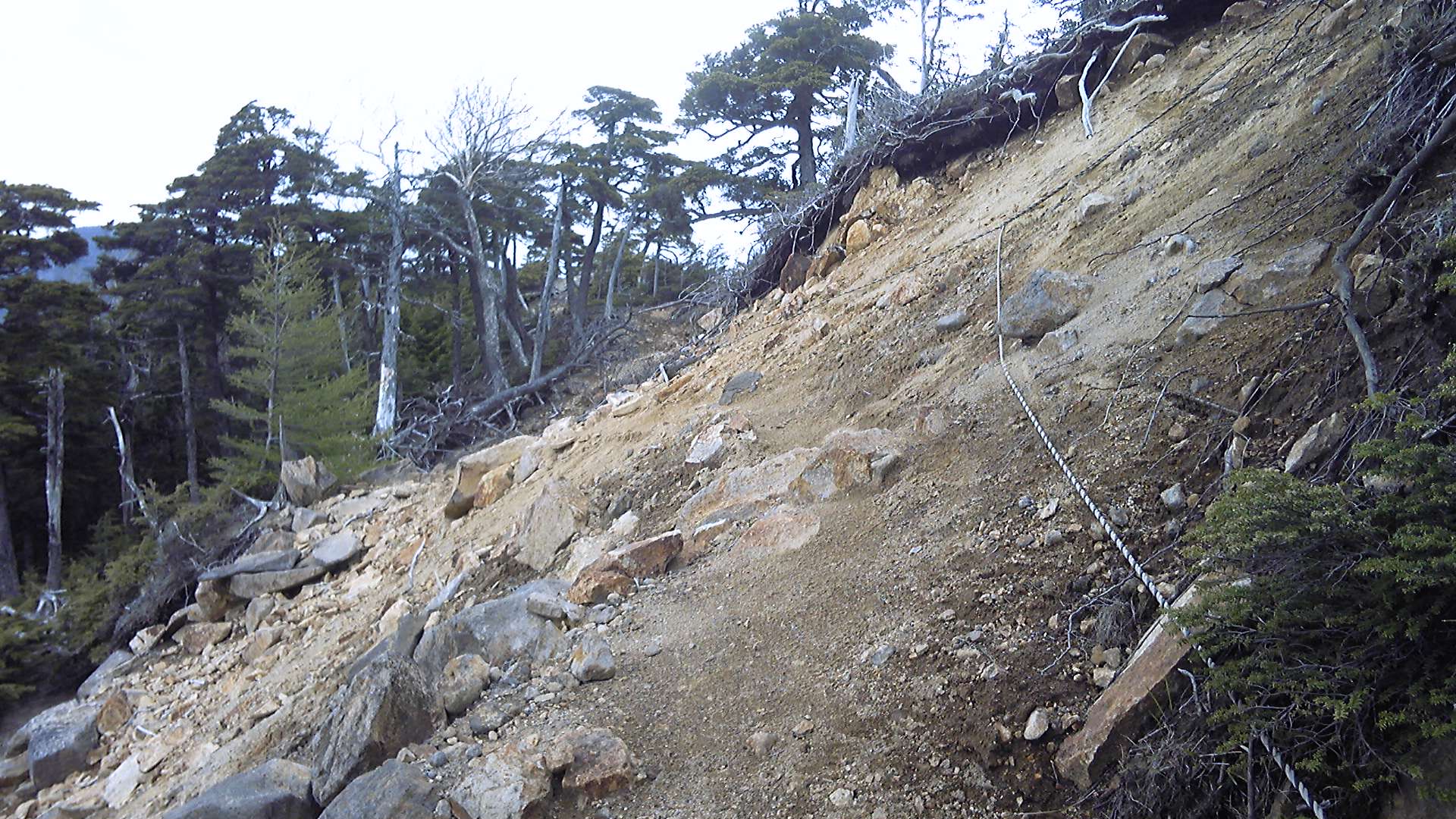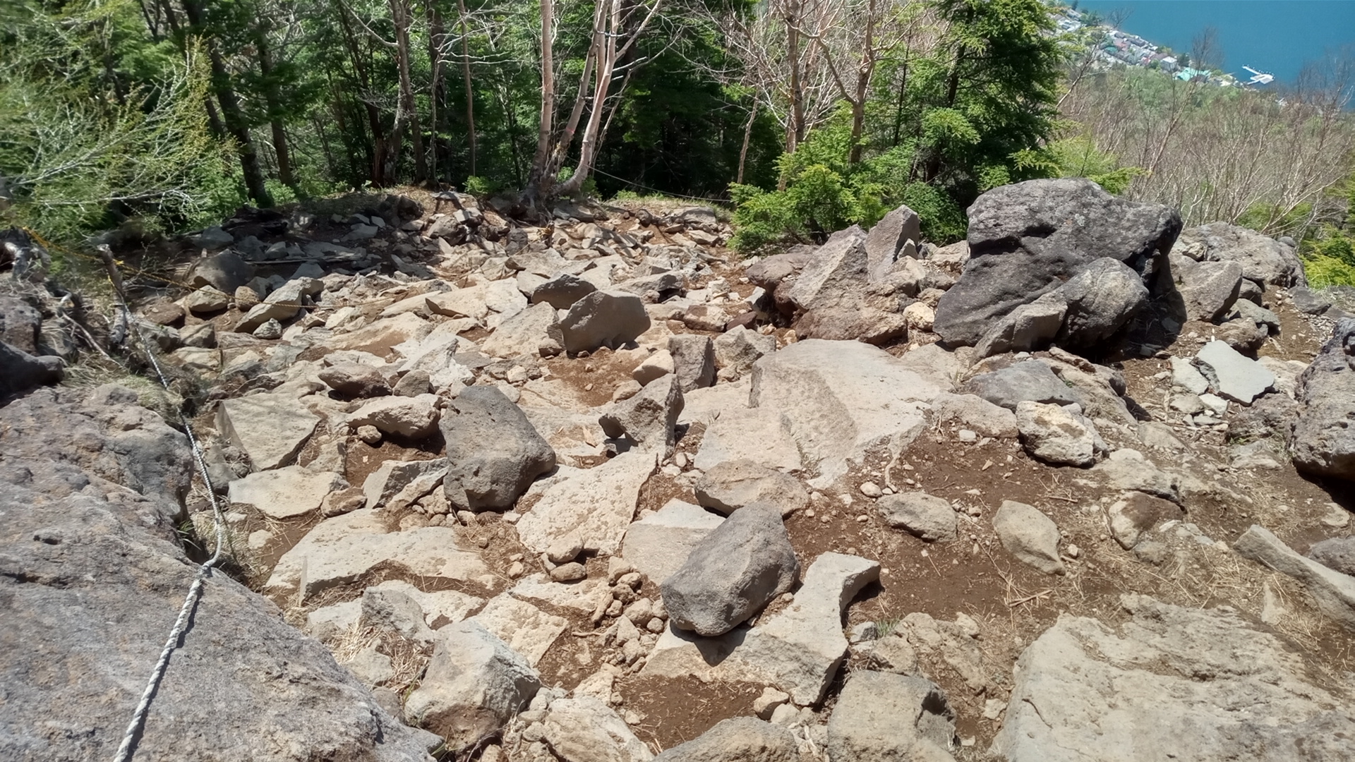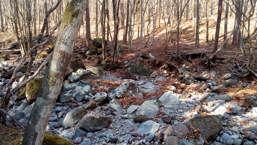 このあたりは踏み跡が錯綜していて、それらしき道筋がいくつもある。いずれも、ササが伸びた踏み跡が続くと、突然ガレ場になる。大雨が降ると川になるようにも見えない地形なので、かつての火山活動によるものだろう。