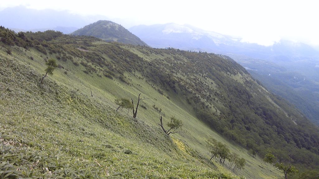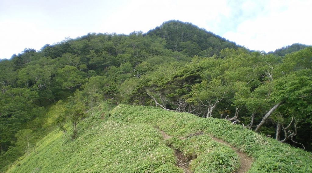 焼石金剛を過ぎると、この日一番歩きやすい尾根に出る。左側がきつい斜面でササ、右側がやや緩い斜面の自然林である。緑と深緑のコントラストの中間を登る。傾斜はそこそこあるが、でこぼこしていないので歩きやすい。