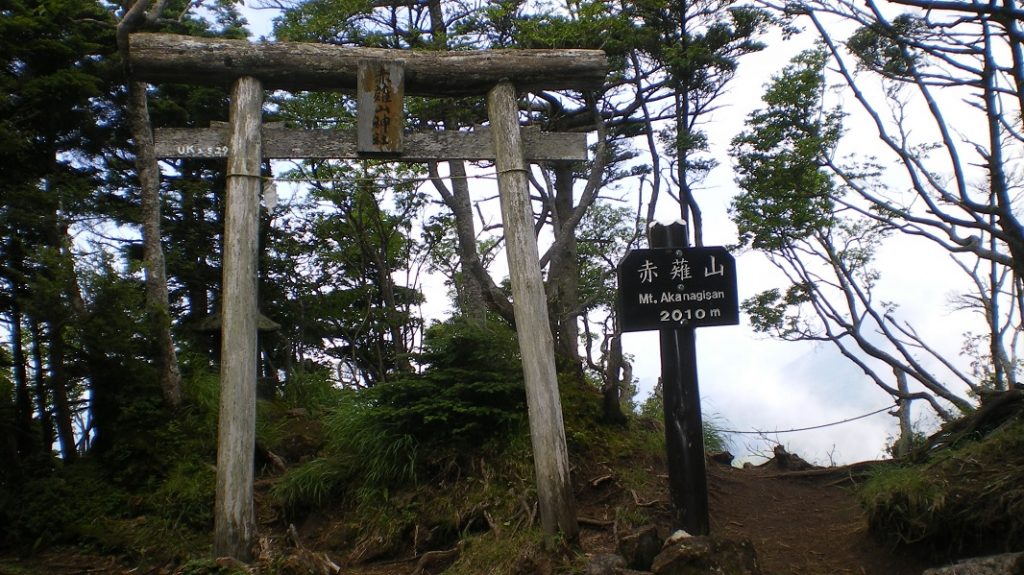赤薙山頂上には、小さな石の祠とたいそう立派な木の鳥居があり、山名標が掲げられている。山名標の周囲は少し平らになって三角点標石が置かれているが、木々に囲まれて展望はあまりない。