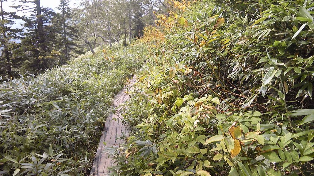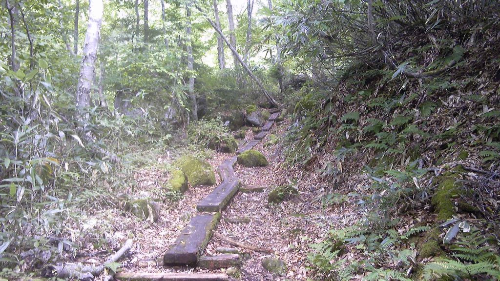 ヒナタオソロシの滝分岐を右に折れて、いよいよ山道が始まる。ガイドブックでは、八丁の湯・加仁湯間、加仁湯・日光澤間、日光澤・オロオソロシ展望台間はほとんど同じ距離に見えるのだけれど、とんでもない。前者2つは10分か15分の距離だが、日光澤より先は1時間以上かかる。