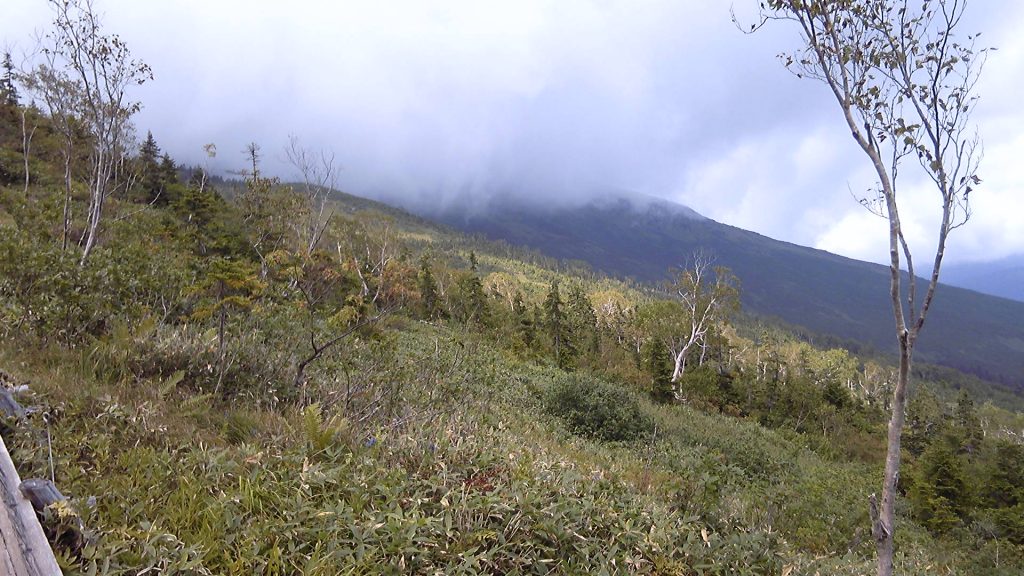 この尾根にきて再び見通しが開けたが、雲はここまで下りてきていて、南側の斜面から霧が次々と登ってくるのが見える。あれほど開けていた視界がみるみる小さくなり、小雨までぱらついてきた。